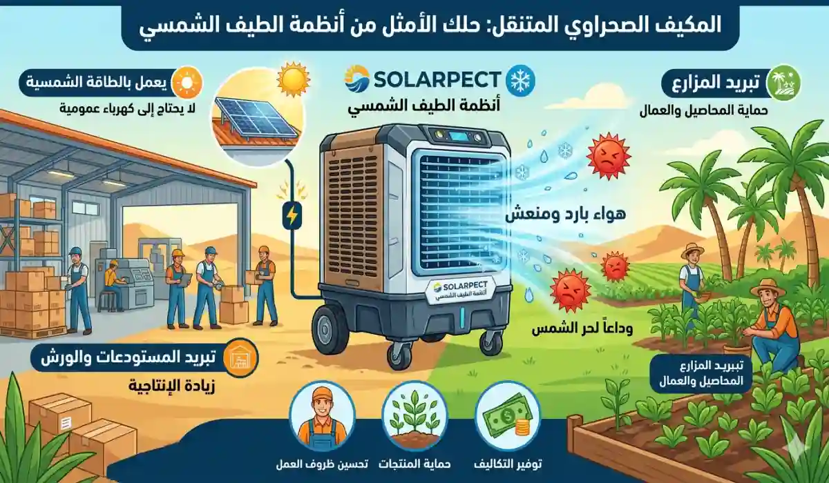لا تتردد في تجربة مكيف صحراوي متنقل من أنظمة الطيف الشمسي، وتواصل معنا الآن للاستفسار عن سعر مكيف صحراوي للمزارع