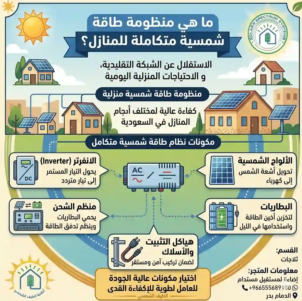 إذا كنت تبحث عن منظومة طاقة شمسية متكاملة تناسب احتياج منزلك في السعودية، يقدم لك متجر أنظمة الطيف الشمسي باقة من أفضل الأنظمة الجاهزة، سواء للاستخدام المتوسط أو العالي، مع تركيب وتوصيل شامل.