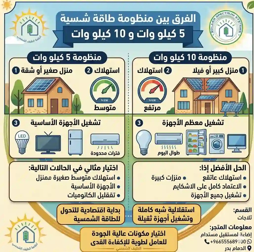 الفرق يكمن في القدرة والإنتاج. منظومة طاقة شمسية 5 كيلو وات مناسبة للاستهلاك المتوسط وتشغيل الأجهزة الأساسية، بينما منظومة طاقة شمسية 10 كيلو وات توفر طاقة أكبر لتشغيل معظم الأجهزة والمكيفات بشكل مستمر، وهي جزء من منظومة طاقة شمسية متكاملة للمنازل الكبيرة.