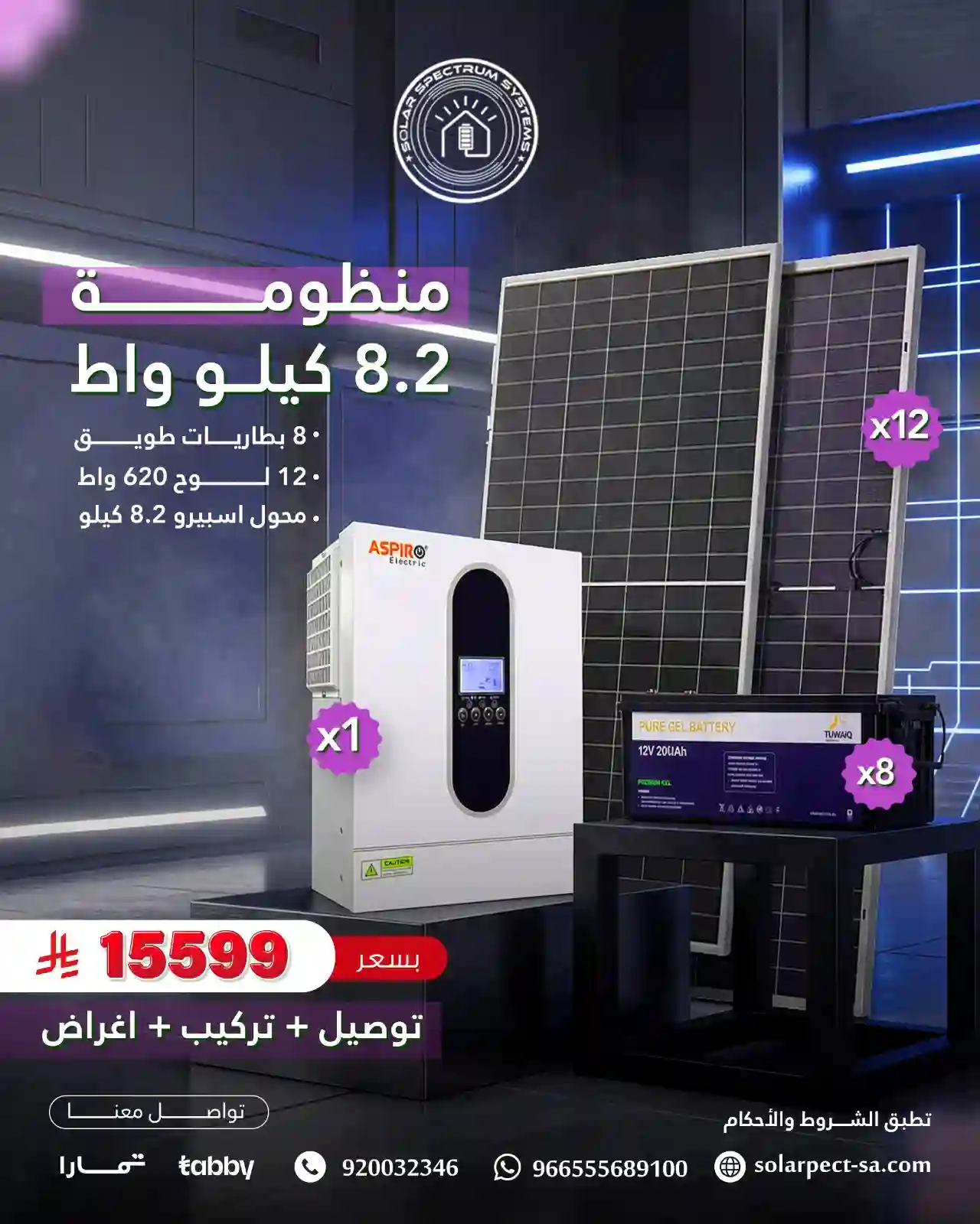 امتلك منظومة طاقة شمسية 8.2 كيلو وات من أنظمة الطيف الشمسي، تحتوي على (8 بطاريات طويق - 12 لوح - محول أسبيرو)