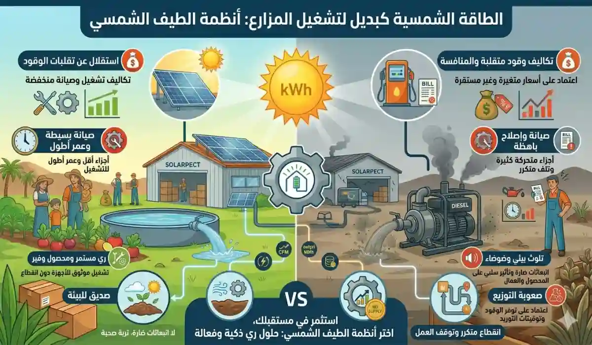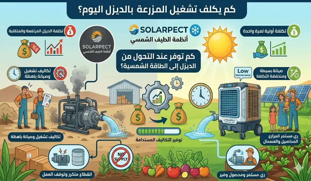 والسؤال الجوهري الذي يطرح نفسه هنا: هل لا يزال الديزل "أرخص" أم أن الشمس أصبحت هي الحل الأذكي؟ دعني أوضح لك أن الحسابات القديمة لم تعد صالحة على الإطلاق خاصة بعدما أصبحت الشمس بديل الديزل للمزارع، ومن خلالها يمكنك توفير آلاف الريالات شهريًا.